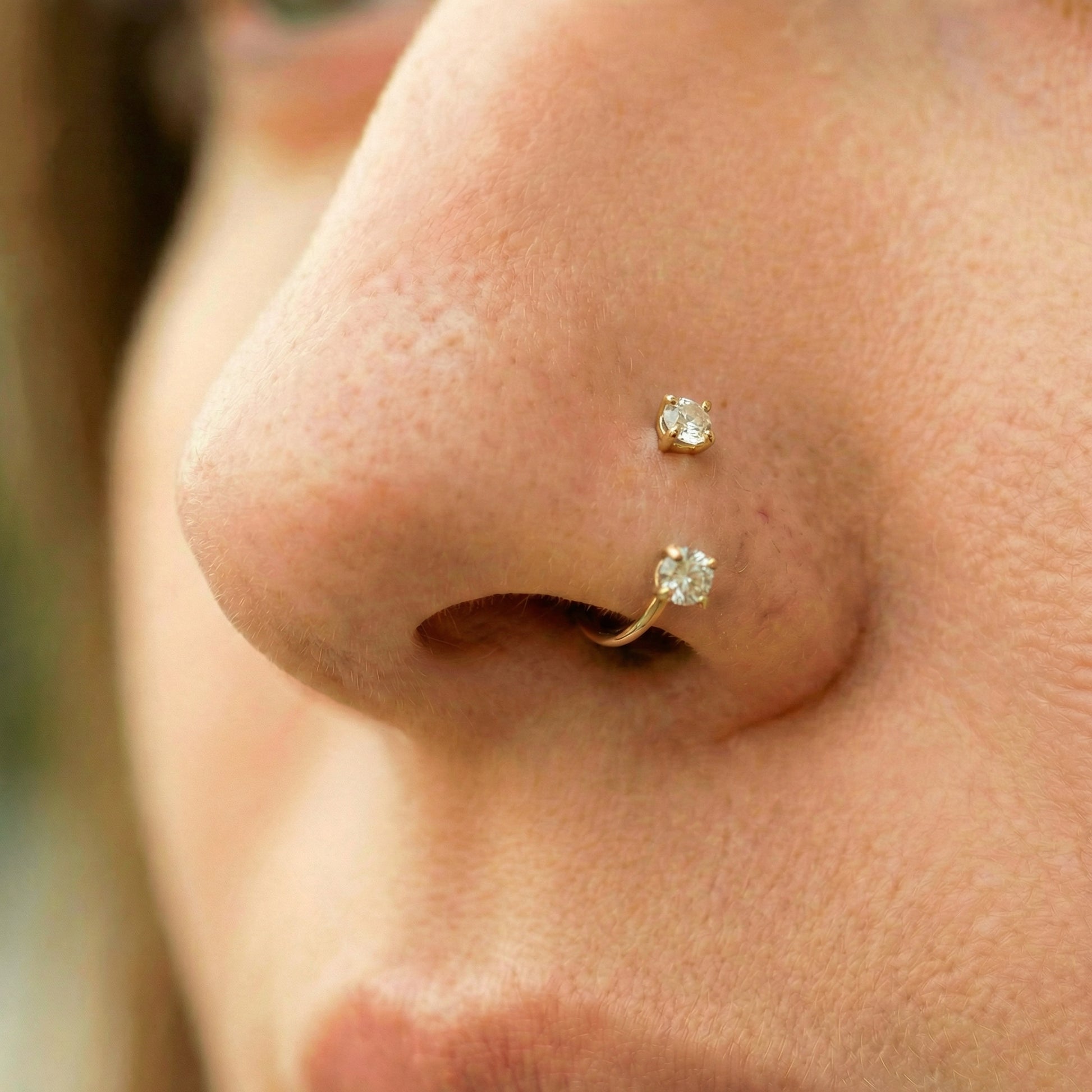 Insert the ring. Slide the curved bar through your nostril piercing from the outside until it sits comfortably in place.